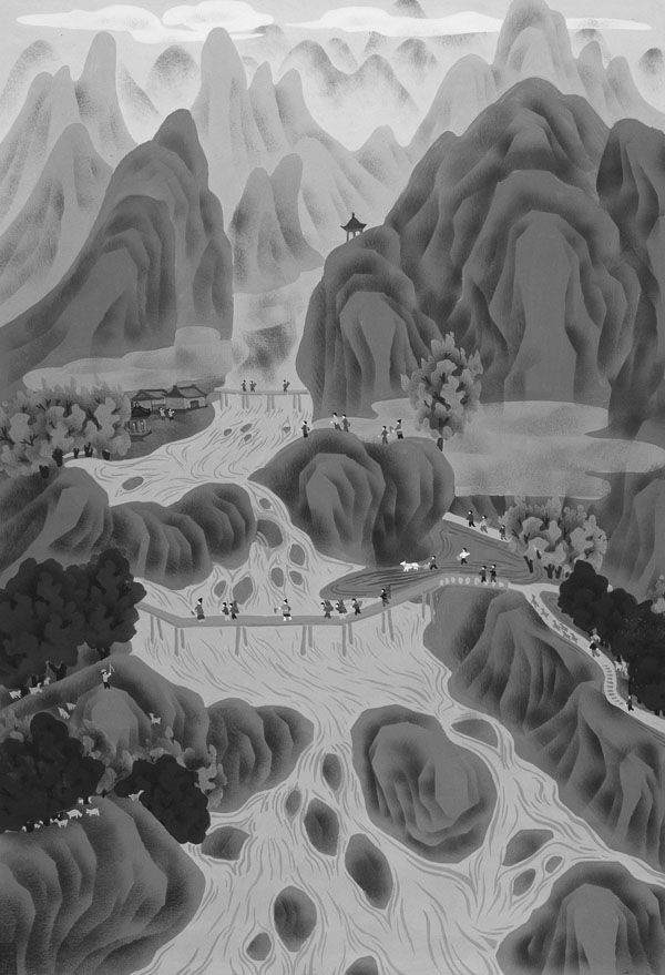 我们离开了丰都和镐都被埋葬了的遗址,继续向西进发。在大王镇,我们掉头向南,停下来接受又一次警察检查,最后到达户县县城。在县城中心附近的一条侧街上,我们停在一座展览馆前。1958年,中央政府开始鼓励农民从事艺术创作和手工艺制作。从那时起,户县农民就成为中国最有名的画家中的一个族群。无论什么时候,只要农活儿不太忙,他们就会骑上自行车,来到当地的艺术中心。中心给他们提供纸、画笔、海报画和少得不能再少的指导。