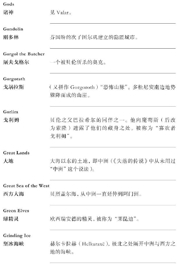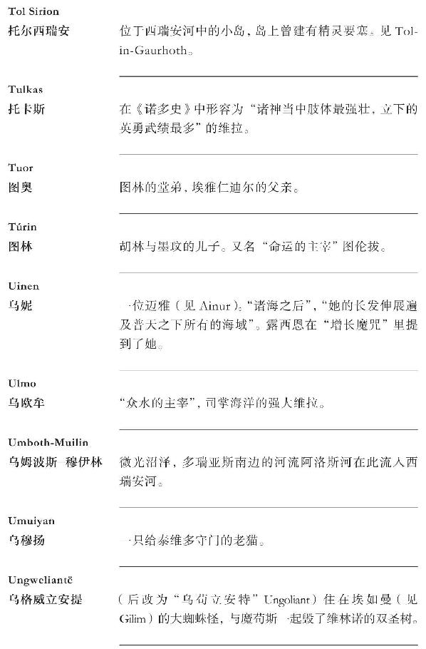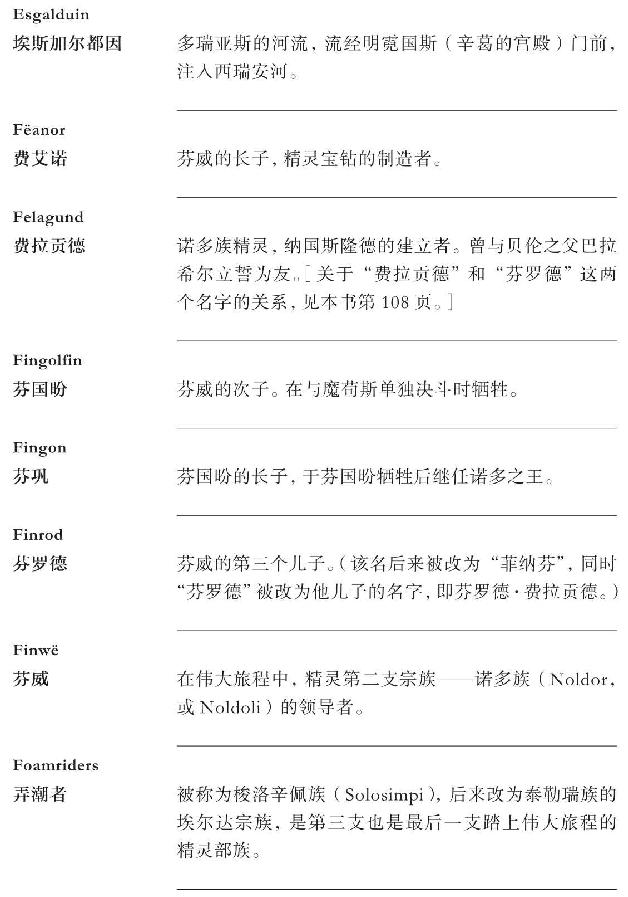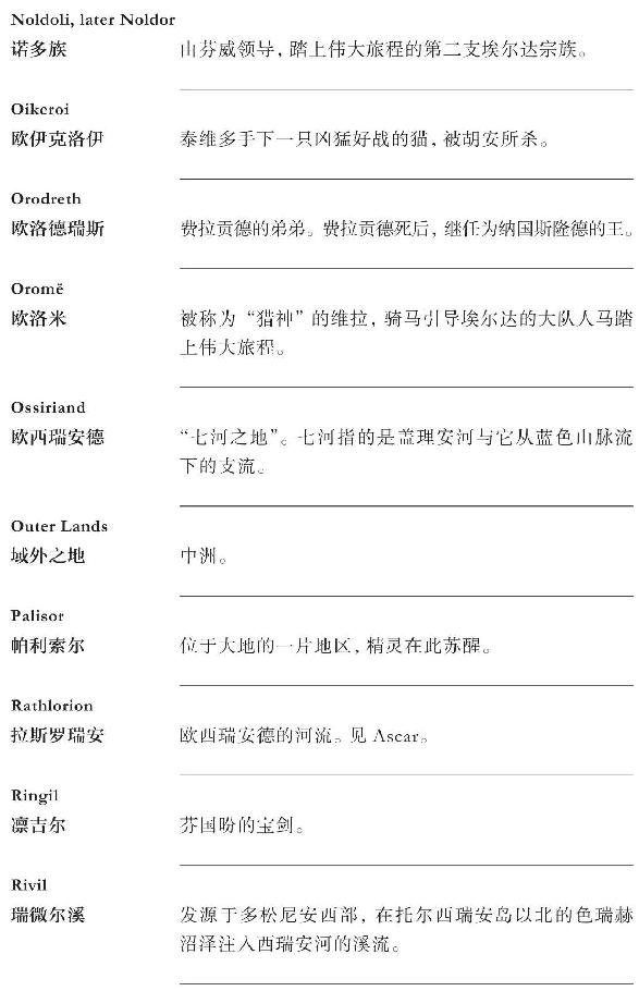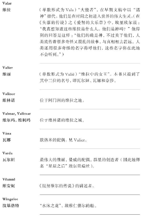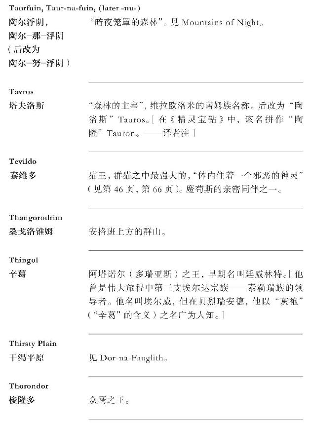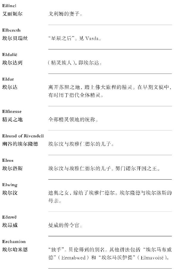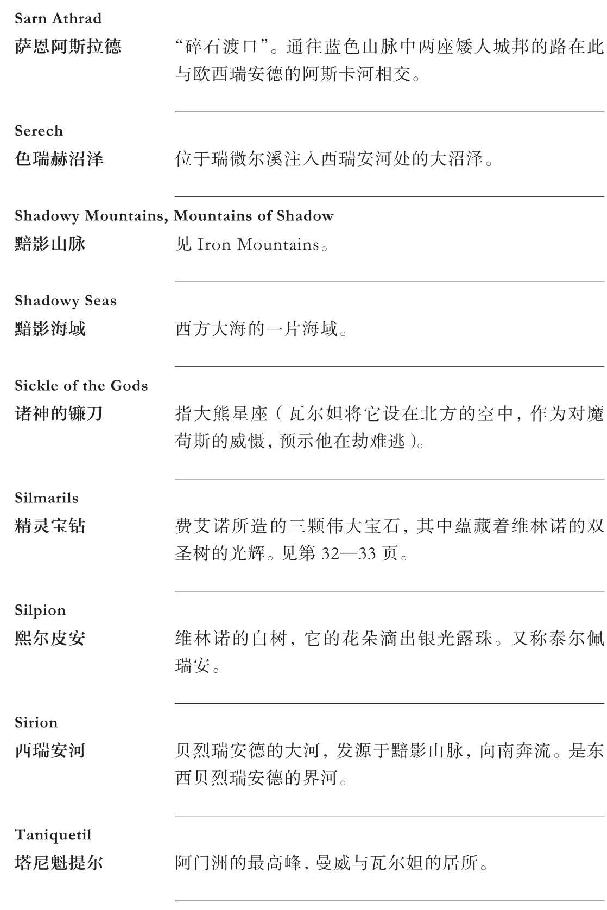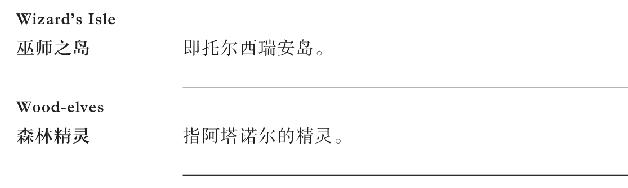 对本书来说,这两个目的都绝对不算至关重要。首先,本表旨在协助那些不能从大量名称(以及不同形式的名称)中回忆起某个在故事中可能具有重要意义的名词的读者。其次,某些名称,特别是那些在文本中很少出现或只出现过一次的名称,得到了稍微完整一点的解释。例如,埃尔达“因为乌格威立安提的缘故”(见第38页)不肯碰蜘蛛,这在故事中显然无关紧要,但读者还是有可能想知道这是为什么。