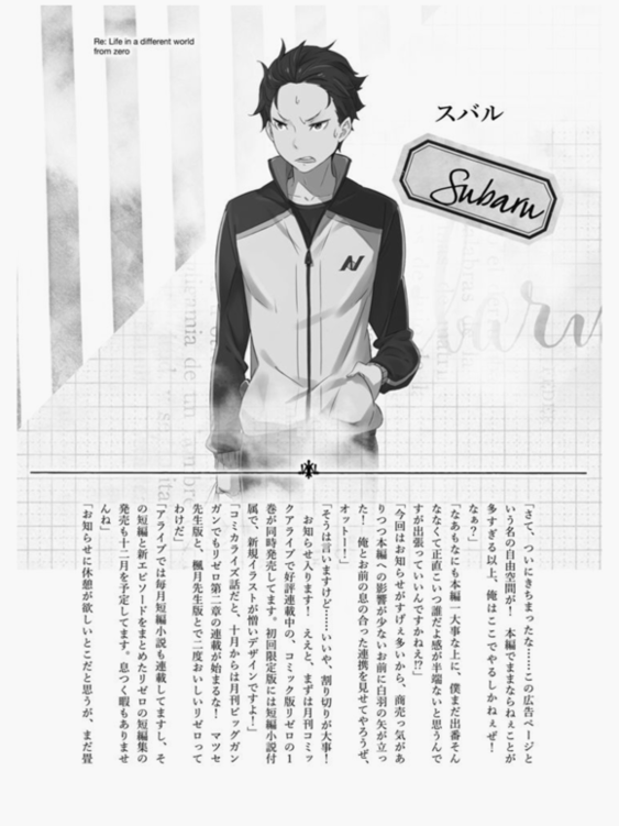 再次,REZERO的漫画化也开始了,第一章在越看comic alive上连载的是マシセダイチ先生。第二章是枫月诚先生在ビッグガンガン上连载。这孩子那孩子都被表情生动地描绘出来,实在是作者幸运至极了。十分感谢!