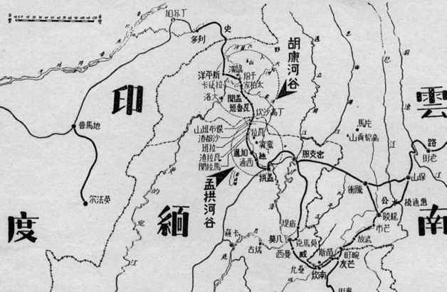 远征军时代的缅北战场示意图,可以看到很多译法与现在不同,字也是从右向左排的。